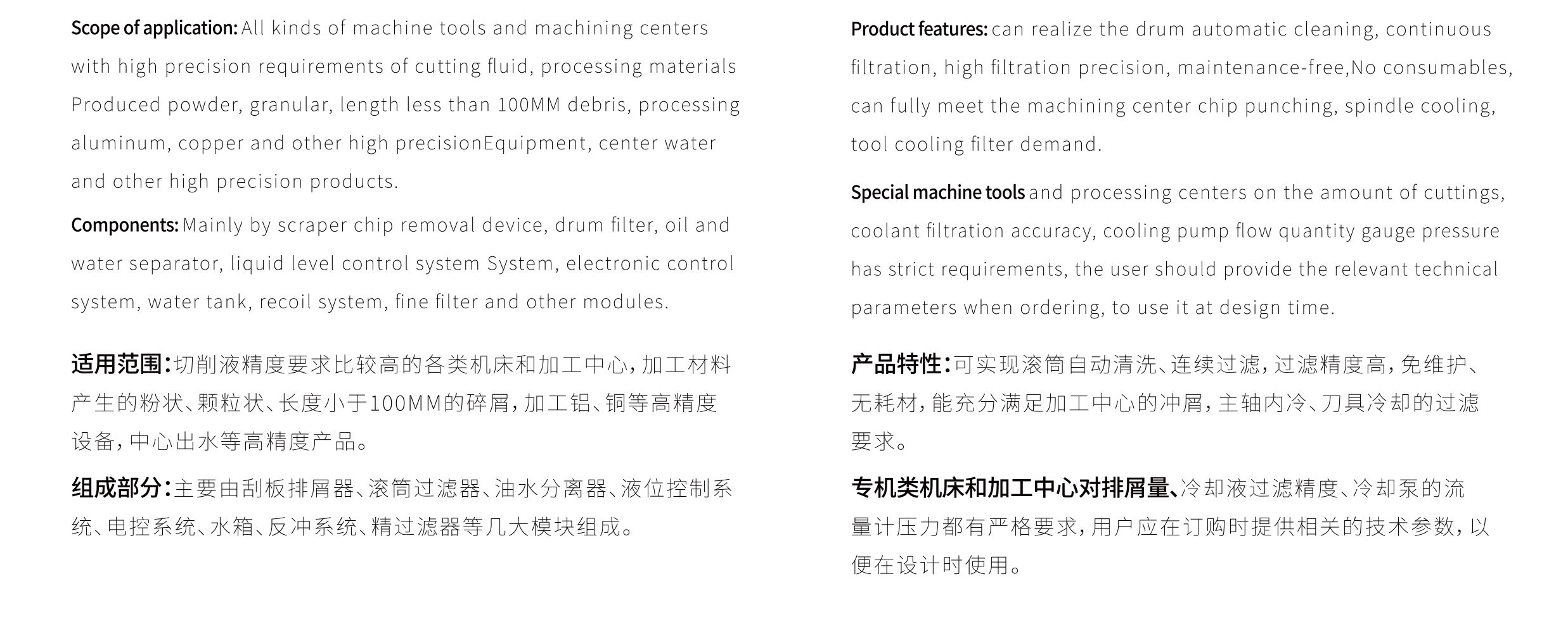適用范圍:切削液精度要求比較高的各類機床和加工中心,加工材料產(chǎn)生的粉狀、顆粒狀、長度小于100MM的碎屑,加工鋁、銅等高精度設(shè)備,中心出水等高精度產(chǎn)品。