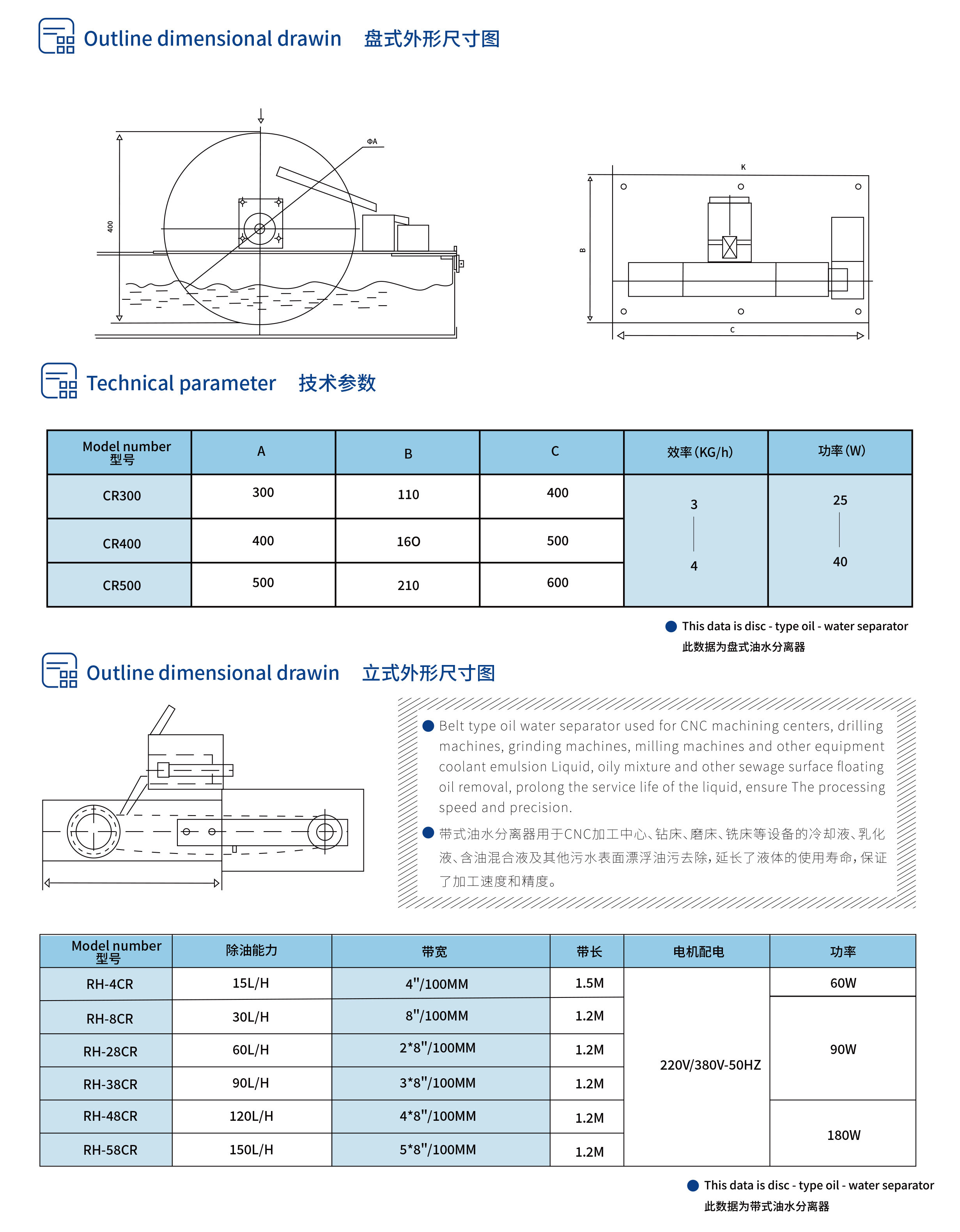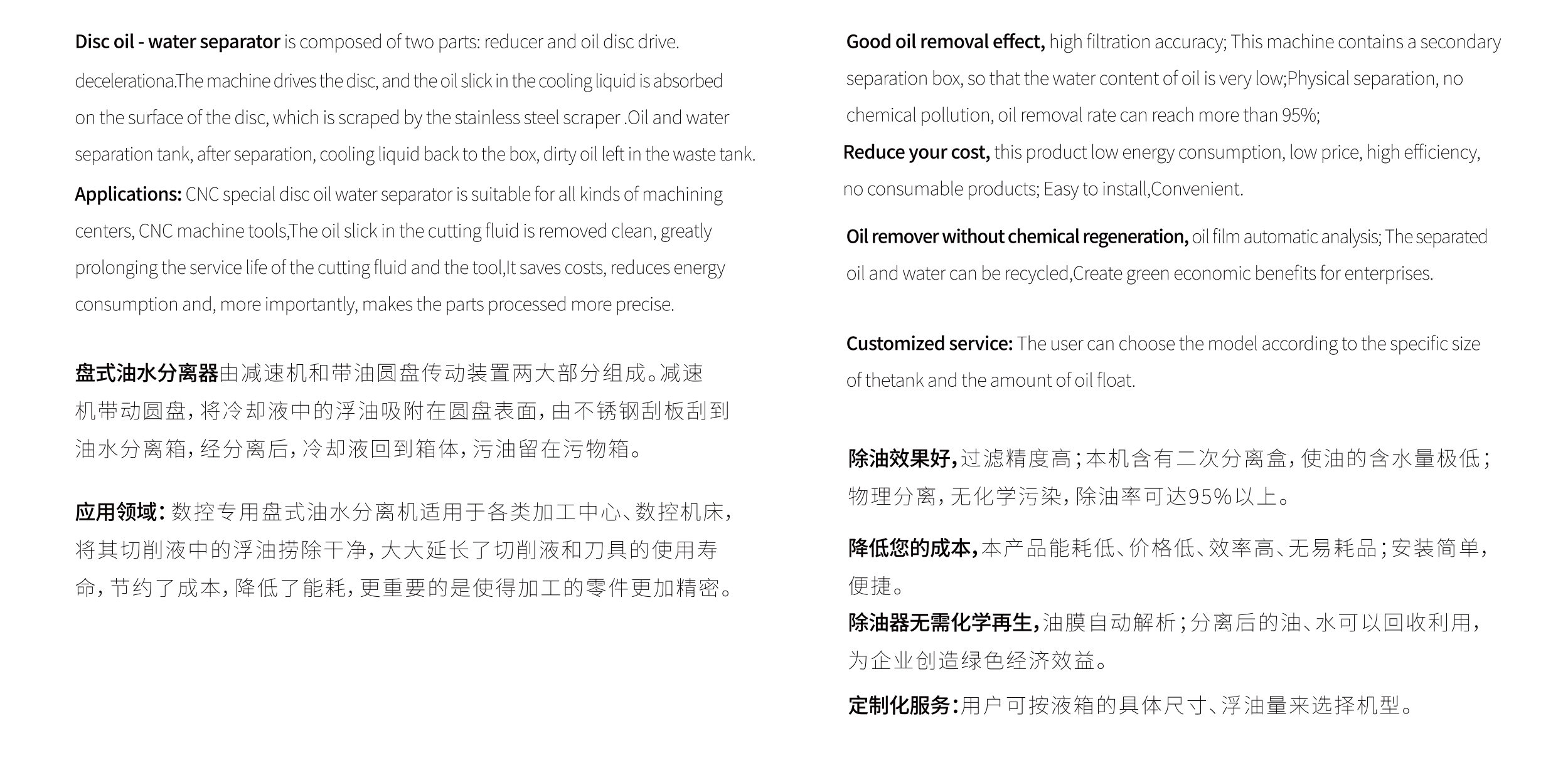 盤式油水分離器由減速機和帶油圓盤傳動裝置兩大部分組成。減速機帶動圓盤,將冷卻液中的浮油吸附在圓盤表面,由不銹鋼刮板刮到油水分離箱,經(jīng)分離后,冷卻液回到箱體,污油留在污物箱。