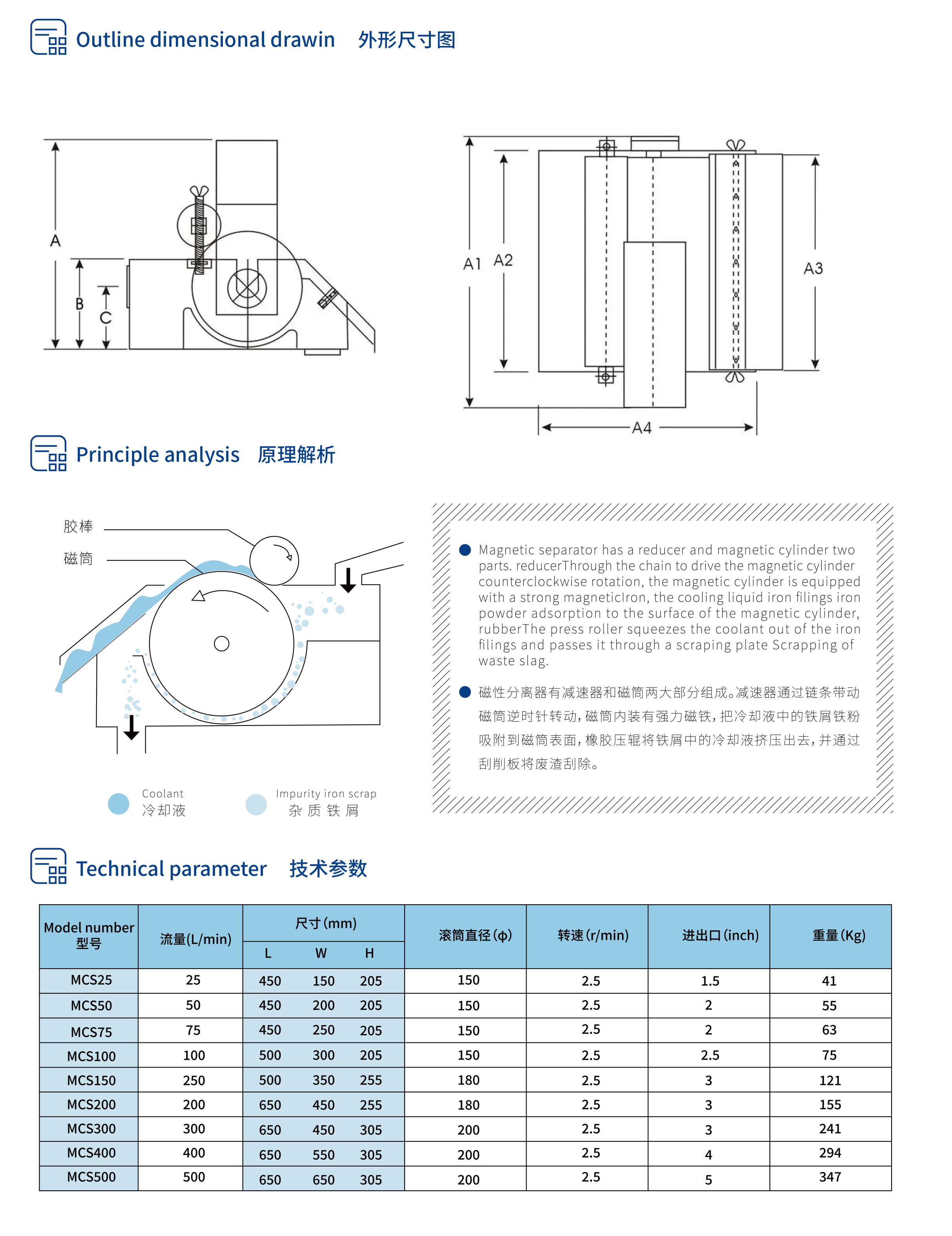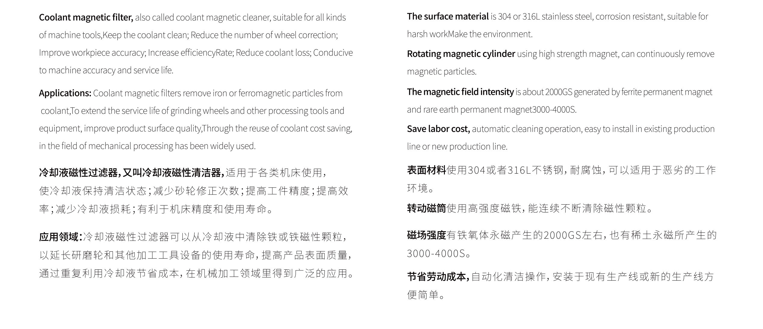 冷卻液磁性過濾器,又叫冷卻液磁性清潔器,適用干各類機(jī)床使用,使冷卻液保持清潔狀態(tài);減少砂輪修正次數(shù);提高工件精度;提高效率;減少冷卻液損耗;有利于機(jī)床精度和使用壽命。