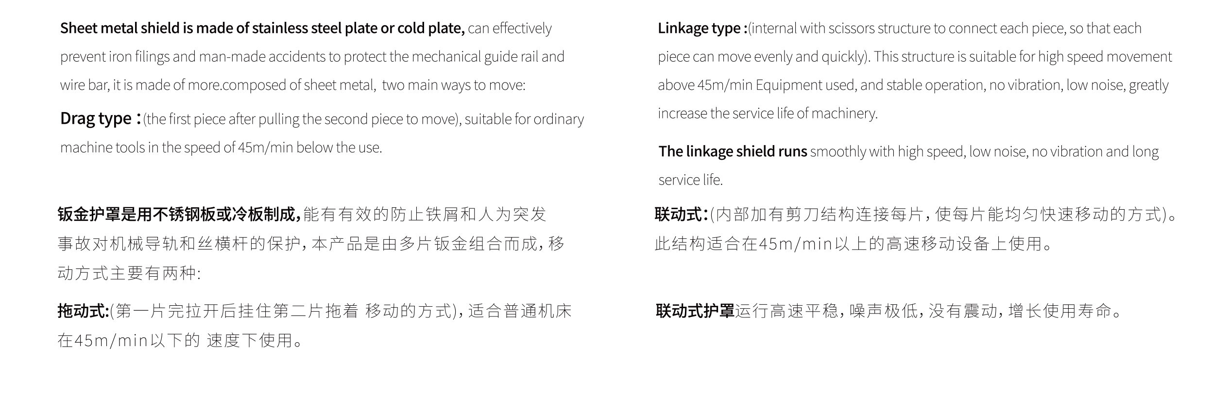 鈑金護(hù)罩是用不銹鋼板或冷板制成,能有有效的防止鐵屑和人為突發(fā)事故對(duì)機(jī)械導(dǎo)軌和絲橫桿的保護(hù),本產(chǎn)品是由多片鈑金組合而成。