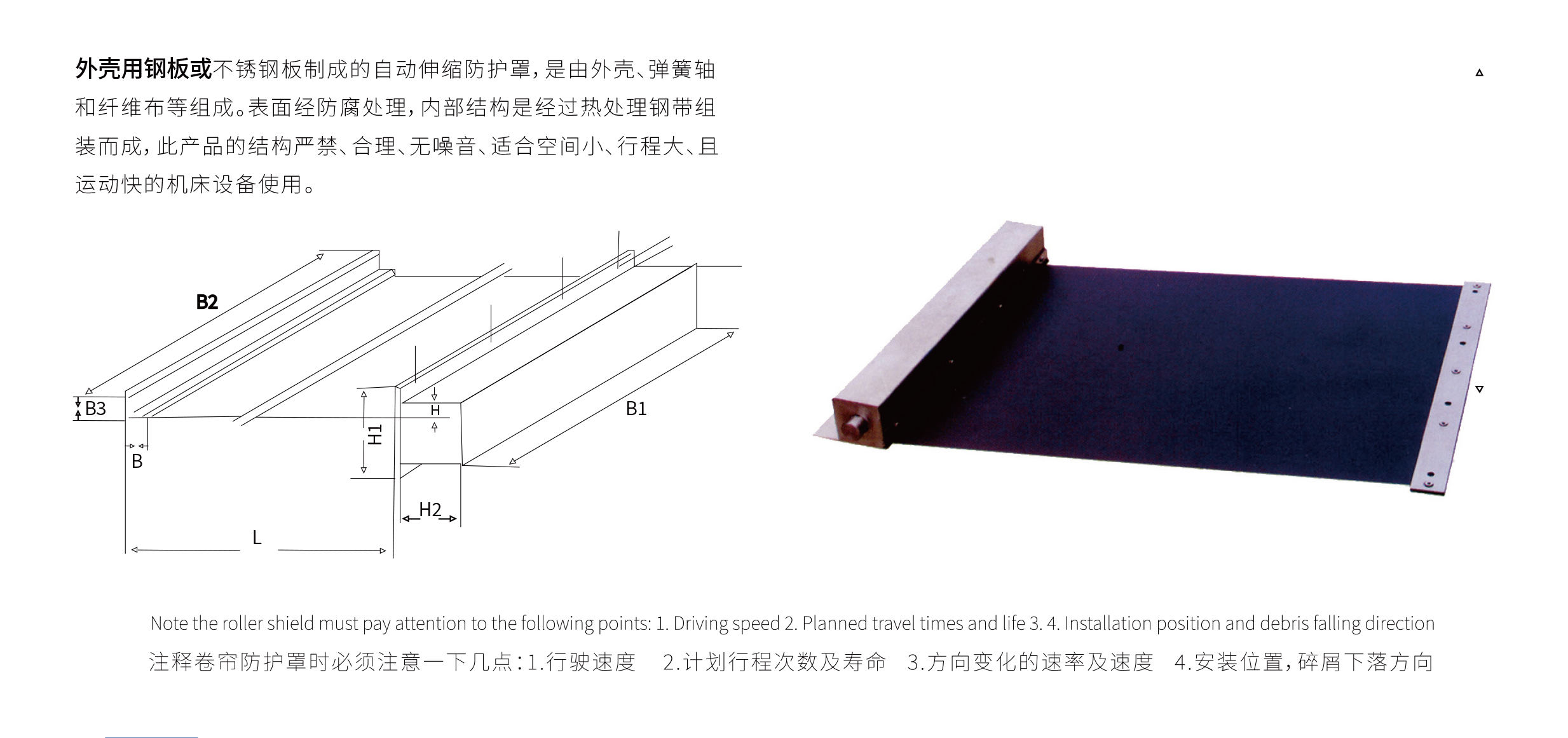 外殼用鋼板或不銹鋼板制成的自動(dòng)伸縮防護(hù)罩,是由外殼、彈簧軸 和纖維布等組成。表面經(jīng)防腐處理,內(nèi)部結(jié)構(gòu)是經(jīng)過(guò)熱處理鋼帶組 裝而成,此產(chǎn)品的結(jié)構(gòu)嚴(yán)禁、合理、無(wú)噪音、適合空間小、行程大、且運(yùn)動(dòng)快的機(jī)床設(shè)備使用。